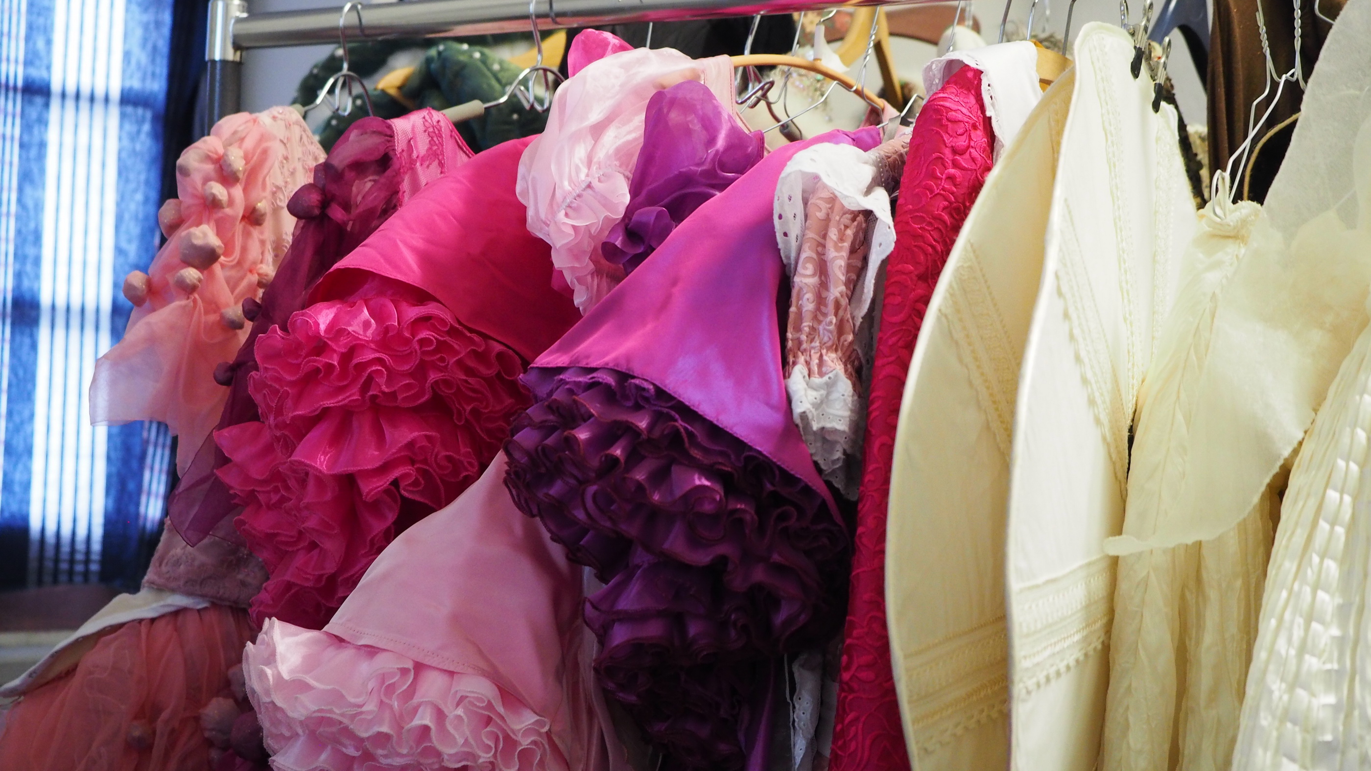 Das wahre Märchenwunderland befindet sich nicht hier unten in der Werkstatt, sondern in den weiß getünchten verwinkelten Räumen unter dem Dach der Remise. „Im Turm“, wie Ulla Röhrs sagt. Über eine Wendeltreppe, die bei jedem Schritt fast unmerklich zittert, steigt die kleine Gesellschaft hinauf. Hier oben hängen Hunderte und Aberhunderte von Kostümen aus drei Jahrzehnten. Aufgereiht stehen Kleiderstangen. Kostüme geordnet nach Geschlecht, nach Mode-Epochen oder Fantasiefiguren. Tüll und Samt, Satin und Filz, Leder und Flitterkram. Die Dachgauben sind mit dunklen Tüchern verhängt, damit das Sonnenlicht die Stoffe nicht ausbleicht.